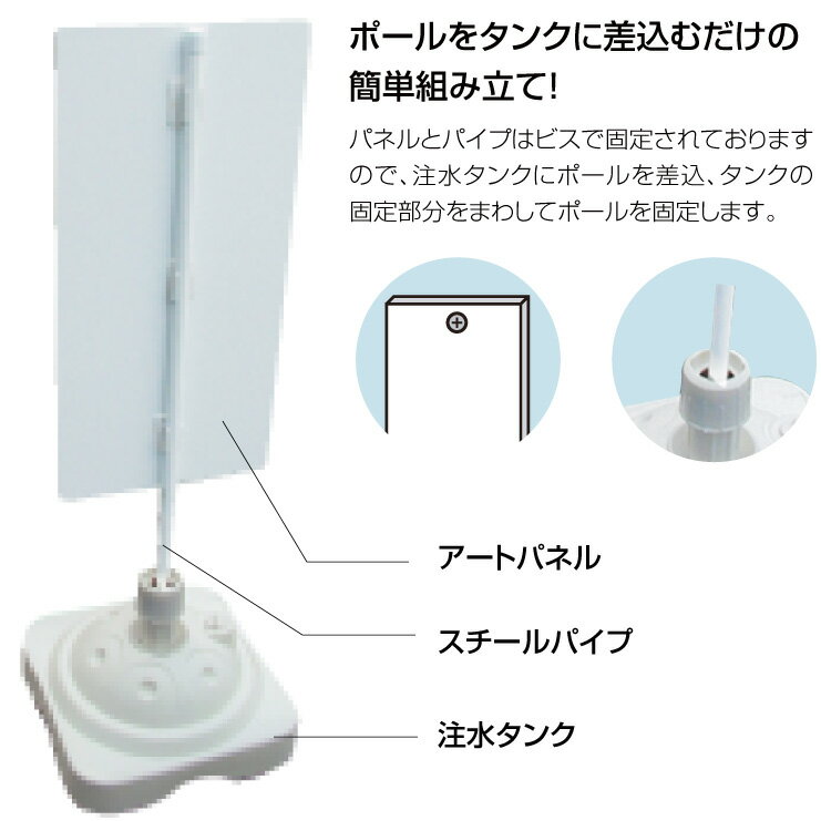 サイズ・材質 ポール材質:スチール塩ビ巻 面板材質:両面アートパネル3mm 面板サイズ:W300×H910 全体サイズ:W350×H1200×D350 注水タンク:W350×W350 満水時11kg 納期:7〜10営業日以内出荷 デザインについて:社名、電話番号、文章、色については自由にアレンジできます。